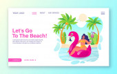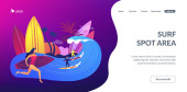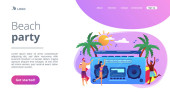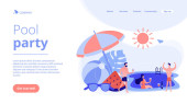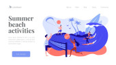 Drobni ludzie dorośli grający w siatkówkę, surfing i kitesurfing. Atrakcje letnie na plaży, rozrywka nad morzem, koncepcja usług animacji morskiej. Strona główna lądowanie strony internetowej szablon strony.