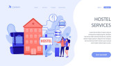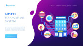 Luksusowy hotel, rezerwacja noclegów. Darmowe wifi, sprzątanie pokoju. Zarządzanie hotelarstwem, procesy biznesowe hoteli, koncepcja systemu zarządzania hotelami. Strona główna lądowanie strony internetowej szablon strony.