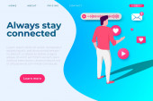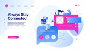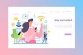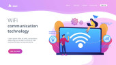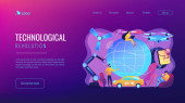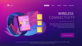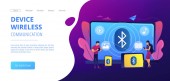 Drobni ludzie połączeni z wieloma inteligentnymi urządzeniami w inteligentnym mieście. Połączone życie, globalne usługi online, koncepcja sieci inteligentnych urządzeń. Strona internetowa żywe fioletowe lądowania szablon strony internetowej.