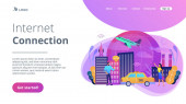 Zdjęcie "Drobni ludzie połączeni z wieloma inteligentnymi urządzeniami w inteligentnym mieście. Połączone życie, globalne usługi online, koncepcja sieci inteligentnych urządzeń. Strona internetowa żywe fioletowe lądowania szablon strony internetowej." może być wykorzystywane do celów osobistych i komercyjnych zgodnie z warunkami zakupionej licencji Royalty-free. Obraz jest dostępny do pobrania w jakości wysokiej rozdzielczości do 5760x3840.