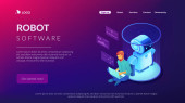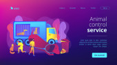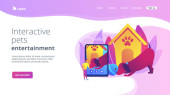 Wyprowadzacz psów i aplikacja opiekunka na smartfona. Robotyczne opiekunki do zwierząt, interaktywna rozrywka dla zwierząt domowych, miej oko na koncepcję swoich zwierząt domowych. Strona główna lądowanie strony internetowej szablon strony.
