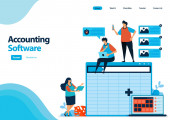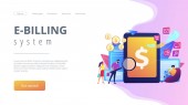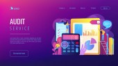 Księgowi pracują z oprogramowaniem i tabletem transakcji finansowych. Księgowość przedsiębiorstw, system księgowości IT, koncepcja inteligentnych narzędzi dla przedsiębiorstw. Strona internetowa żywe fioletowe lądowania szablon strony internetowej.