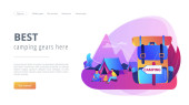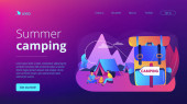 Namiot w lesie, turyści wędrujący, wakacje z plecakiem. Letni kemping, rodzinna przygoda kempingowa, obóz sypialny, najlepsze wyposażenie kempingowe tutaj. Strona główna lądowanie strony internetowej szablon strony.