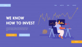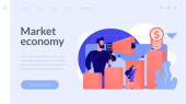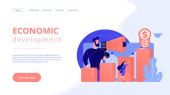 Ekonomista z megafonem, kolumną wzrostu gospodarczego i wykresem produktywności rynkowej. Rozwój gospodarczy, światowy ranking gospodarki, koncepcja gospodarki rynkowej. Strona internetowa żywe fioletowe lądowania szablon strony internetowej.
