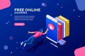 Zdjęcie "E-learning, zajęcia online i webinaria. Zdalne studia informatyczne. Kursy tworzenia stron internetowych, programowanie stron internetowych, najlepsza koncepcja kursów kodowania online. Strona główna lądowanie strony internetowej szablon strony." może być wykorzystywane do celów osobistych i komercyjnych zgodnie z warunkami zakupionej licencji Royalty-free. Obraz jest dostępny do pobrania w jakości wysokiej rozdzielczości do 5760x3840.