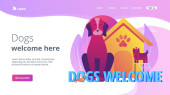 Zdjęcie "Pet hotel, przedszkole. Przyprowadzam szczeniaka do stajni, do weterynarza. Usługi dla zwierząt domowych, usługi opieki nad zwierzętami, oferujemy najlepsze dla koncepcji swojego zwierzaka. Strona główna lądowanie strony internetowej szablon strony." może być wykorzystywane do celów osobistych i komercyjnych zgodnie z warunkami zakupionej licencji Royalty-free. Obraz jest dostępny do pobrania w jakości wysokiej rozdzielczości do 5760x3840.