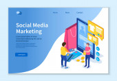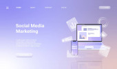 Specjaliści od mediów społecznościowych zarządzają wieloma kontami na ogromnym laptopie. Deska rozdzielcza mediów społecznościowych, internetowy interfejs marketingowy, koncepcja metryki mediów społecznościowych. Strona internetowa żywe fioletowe lądowania szablon strony internetowej.
