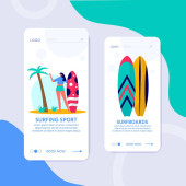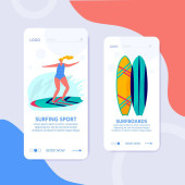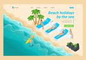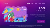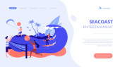 Nauczyciel surfingu, fala na desce surfingowej w oceanie, malutcy ludzie. Szkoła surfingu, miejsce do surfowania, naucz się tu surfować. Strona główna lądowanie strony internetowej szablon strony.