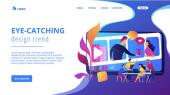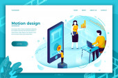 Projektanci graficzni na ekranie komputera tworzenie i przesyłanie wideo. Projekt graficzny ruchu, usługa produkcji wideo, koncepcja pracy projektanta ruchu. Strona internetowa żywe fioletowe lądowania szablon strony internetowej.