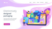 Strategia marketingowa, kampania promocyjna, projektant tworzący treści. Projektowanie opakowań, charakterystycznie zaprojektowane opakowania, przyciągają uwagę klienta. Strona główna lądowanie strony internetowej szablon strony.
