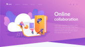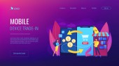 Biznesmeni ściskający dłoń przez smartfona. Mobilna współpraca, narzędzia współpracy i mobilna praca zespołowa, mobilna i innowacyjna koncepcja sieciowa. Strona internetowa żywe fioletowe lądowania szablon strony internetowej.