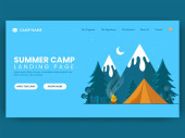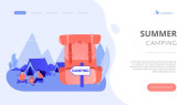 Namiot w lesie, turyści wędrujący, wakacje z plecakiem. Letni kemping, rodzinna przygoda kempingowa, obóz sypialny, najlepsze wyposażenie kempingowe tutaj. Strona główna lądowanie strony internetowej szablon strony.