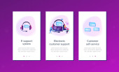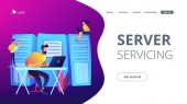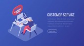 Agenci centrum kontaktowego z słuchawkami pracującymi przy komputerach. Centrum kontaktowe, punkt obsługi klienta, koncepcja zarządzania relacjami z klientami. Strona internetowa żywe fioletowe lądowania szablon strony internetowej.