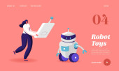 Robot trzyma kosz z praniem i praniem ubrania w pralce. Domowa technologia robotów, prawdziwe roboty, osobiste roboty domowe. Strona internetowa żywe fioletowe lądowania szablon strony internetowej.