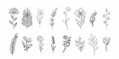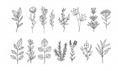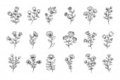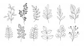 Ręcznie rysowane gałązki kwiatowe. Prosty szkic graficzny w kwiaty z liśćmi sylwetki, zarys stylu odizolowany na białym tle. Ilustracja wektora