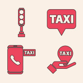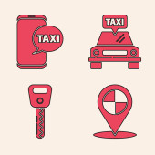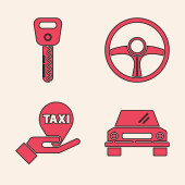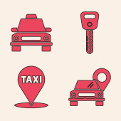 Zestaw Samochód, Wskaźnik mapy z taksówką, Laptop połączenia taksówką i kluczyk samochodowy z ikoną zdalnego. Wektor.