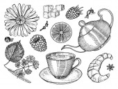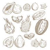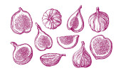 Świeże figi gotowe. Przyprawa do detoksykacji. Suszone owoce, kawałki. Liście, rośliny i gałęzie. Wektor Rysowany ręcznie szkic do etykiety, plakatu lub menu.