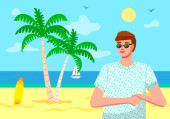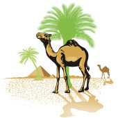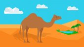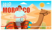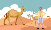 Człowiek w okularach jeździ na wielbłądzie. Podróż do gorących krajów. Słońce i ciepło. Zwierzęta egzotyczne