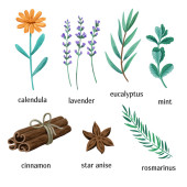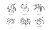 Zestaw naturalnych ikon włókien w płaskim stylu. Bawełna, len, bambus, jedwab i wełna. Ilustracja wektora.