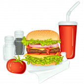 Zdjęcie "Hamburger, napój bezalkoholowy w butelce i szklance. Szybkie żarcie. Jedzenie na drewnianym tle. Ilustracja wektora." może być wykorzystywane do celów osobistych i komercyjnych zgodnie z warunkami zakupionej licencji Royalty-free. Obraz jest dostępny do pobrania w jakości wysokiej rozdzielczości do 5760x3840.