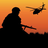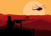 żołnierz wojskowy z postacią z pistoletu i helikoptera w obozie