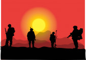 żołnierze wojskowi z bronią sylwetki postacie zachód słońca scena