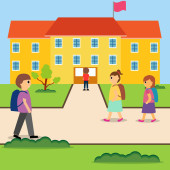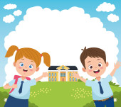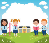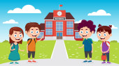 grupa małych uczniów w mundurach w postaciach szkolnych