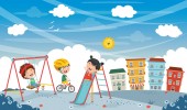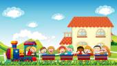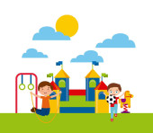 Grupa 5 dzieci bawiących się na placu zabaw spędzających czas w grach, bawiących się. Atrakcje letnie. Szczęśliwe dzieci bawiące się na obozie letnim.