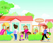 Zdjęcie "Grupa 5 dzieci bawiących się na placu zabaw spędzających czas w grach, bawiących się. Atrakcje letnie. Szczęśliwe dzieci bawiące się na obozie letnim." może być wykorzystywane do celów osobistych i komercyjnych zgodnie z warunkami zakupionej licencji Royalty-free. Obraz jest dostępny do pobrania w jakości wysokiej rozdzielczości do 5760x3840.