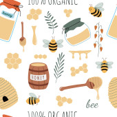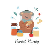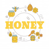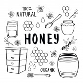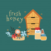 Pocztówka dla miodu, świeży tekst miodu. Beczka z miodem, pszczołami, kwiatami, łyżką. Przydatne do projektowania ulotek, naklejek, banerów, tła. Ilustracja wektora narysowanego ręcznie.