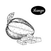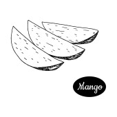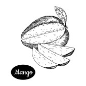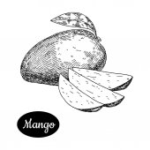 Czarno-biały wektor ilustracji tropikalnych owoców mango na białym tle. Ręcznie rysowane w stylu retro. Do menu, restauracji, broszur, dekoracji zdrowej żywności.