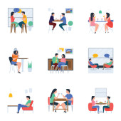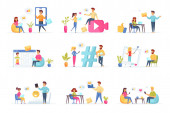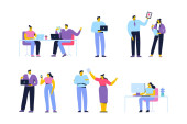 Wolny strzelec sceny pracy wiązane z postaciami ludzi. Wolni strzelcy pracujący i komunikujący się w komfortowych sytuacjach w miejscu pracy. Praca na odległość, praca na własny rachunek zajęcie płaski wektor ilustracja.