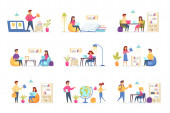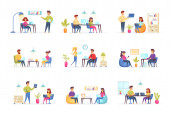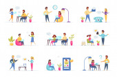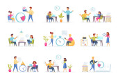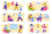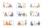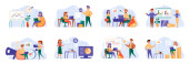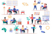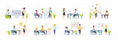 Sceny spotkań biznesowych wiążą się z postaciami ludzi. Negocjacje partnerów, prezentacja menedżera, praca zespołowa kolegów w sytuacjach biurowych. Partnerstwo korporacyjne płaski wektor ilustracji