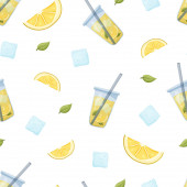 Płynny wzór wektora pokarmowego. Kreskówka ręcznie rysowane cytryna, ogórek, imbir, mięta na białym tle. Płaska ilustracja do tekstyliów, papieru do pakowania, kosmetyków. Składniki detox sassy wody