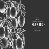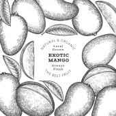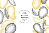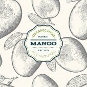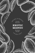 Wzór mango. Ręcznie rysowany wektor tropikalnych owoców ilustracji. Grawerowany owoc. Retro egzotyczny baner spożywczy.
