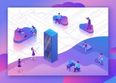 Ilustracja globalnej usługi dostawy z procesu dostarczania paczki, magazyn z ciężarówkami i pudełkami, dostawa samochodem, transport morski, ludzie otrzymują towary kurierem, dronem, w paczkach
