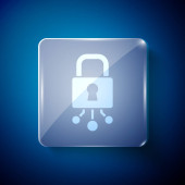 Niebieska ikona bezpieczeństwa cybernetycznego na białym tle. Zamknięta kłódka na obwodzie cyfrowym. Koncepcja bezpieczeństwa. Ochrona danych cyfrowych. Niebieski przycisk koła. Wektor.