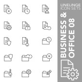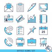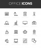 Zarys ikon o biurze. Koncepcja biznesu. Zawiera takie ikony jak biznesmen, businesswoman, miejsce pracy, materiały biurowe i urządzenia. Edytowalny skok Vector 64x64 pikseli idealny