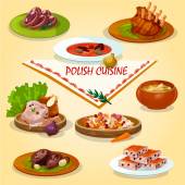 Menu dań kuchni polskiej, tradycyjne dania mięsne i wektorowe. Polskie pierogi ziemniaczane pierogi, kapusta w sosie pomidorowym, karpie i bigos, kiełbaski i ciasto orzechowe