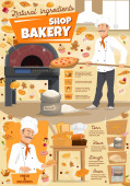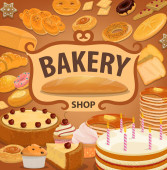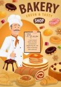 Chleb i ciasto, Cukiernia i cukiernia wektor kucharz. Menu z pieczywem i ciastami, rogaliki i bagietki, słodkie bułeczki i tosty pszenne, słodkie bułeczki pączkowe, piekarz w kapeluszu z bułką