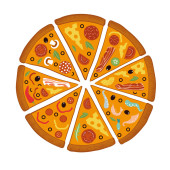 Zdjęcie "Zestaw sześciu różnych kawałków pizzy na drewnianym talerzu. Pizza z różnymi nadzieniami. Ilustracja wektora izolowana na białym tle." może być wykorzystywane do celów osobistych i komercyjnych zgodnie z warunkami zakupionej licencji Royalty-free. Obraz jest dostępny do pobrania w jakości wysokiej rozdzielczości do 5760x3840.