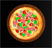 Pizza na drewnianym talerzu. Pizza z różnymi nadzieniami. Ilustracja wektora izolowana na białym tle.