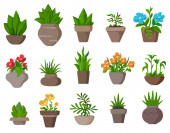 Rośliny domowe w doniczkach. Kolor kolekcja kryty kwiaty jasne fioletowe płatki zielone okrągłe liście podłużne różowe pąki z symbolami strzałek dekoracyjne dekoracji botanicznej. Płaska flora wektorowa.