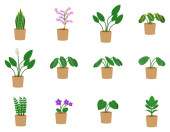 Zdjęcie "Rośliny domowe w doniczkach. Kolor kolekcja kryty kwiaty jasne fioletowe płatki zielone okrągłe liście podłużne różowe pąki z symbolami strzałek dekoracyjne dekoracji botanicznej. Płaska flora wektorowa." może być wykorzystywane do celów osobistych i komercyjnych zgodnie z warunkami zakupionej licencji Royalty-free. Obraz jest dostępny do pobrania w jakości wysokiej rozdzielczości do 5760x3840.