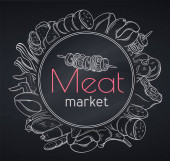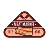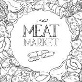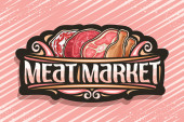 Logo wektorowe targu mięsnego, dekoracyjna plakietka z papieru ciętego z ilustracją różnych kawałków mięsa, oznakowanie z rocznika kwitnie i unikalne litery pędzla dla słów targ mięsny na paski tła