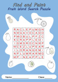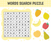 Krzyżówka z owocami. Wektor gra edukacyjna dla dzieci. Puzzle wyszukiwania słów. Mini-gra dla dzieci.