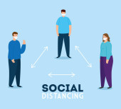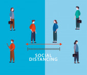 grupa osób noszących maski medyczne ćwiczących dystans społeczny