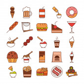 fast food obiad i menu, smaczny posiłek i niezdrowe, ikony obiad restauracja ustawić linię i wypełnić styl