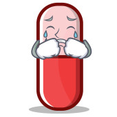 Caricature styl projektowania pigułek butelka leku ze smutną twarzą