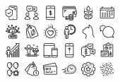 Zestaw ikon biznesowych, takich jak zarządzanie czasem, Torba na zakupy. Dyplom, pomysły, uratować planetę. Prognoza pogody, Wielozadaniowy gest, Kamienie Spa. Pełna rotacja, wietrzna pogoda, histogram. Wektor